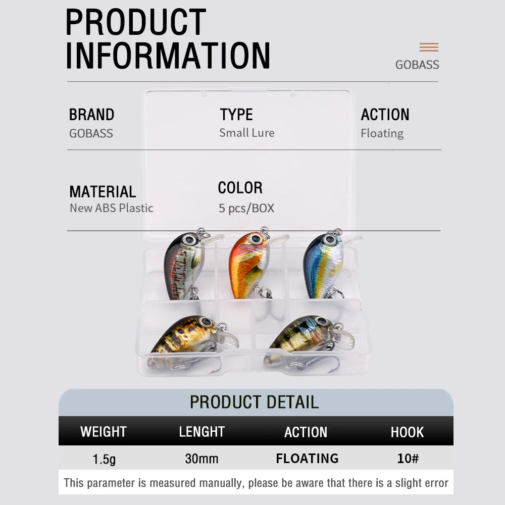 Upgrade your tackle box with the 5pcs Mini Fish Bass Fishing Lure Set. Designed for freshwater anglers, these 3cm, 1.5g mini crankbaits deliver topwater action to attract bass, pike, trout, perch, and more.